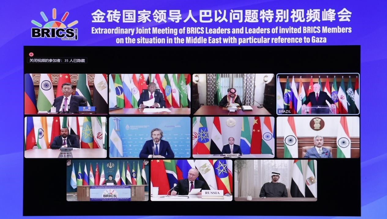 金磚國(guó)家始終是國(guó)際公平正義的堅(jiān)定守護(hù)者。2023年11月21日,習(xí)近平主席在北京出席金磚國(guó)家領(lǐng)導(dǎo)人巴以問(wèn)題特別視頻峰會(huì)并提出三點(diǎn)正義主張。