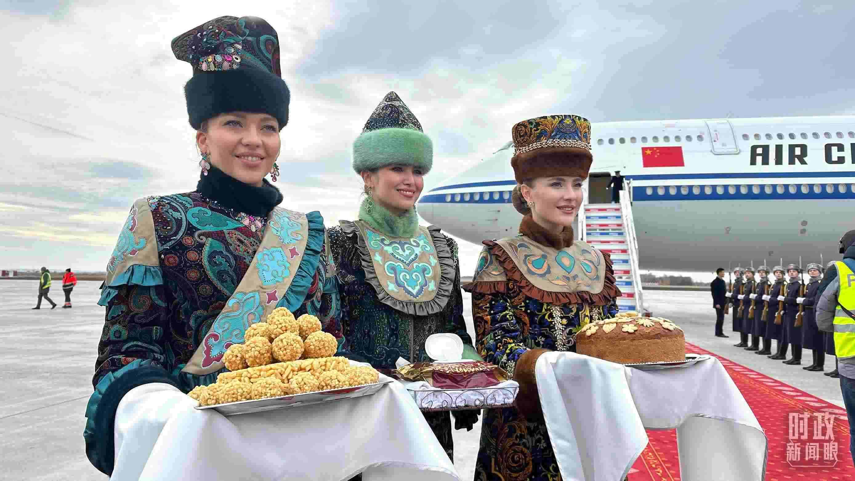△ 習主席專機抵達喀山國際機場時,禮兵在紅毯兩側(cè)列隊致敬,身著民族服裝的俄羅斯女青年用傳統(tǒng)禮節(jié)表示歡迎。(總臺央視記者盧心雨拍攝)