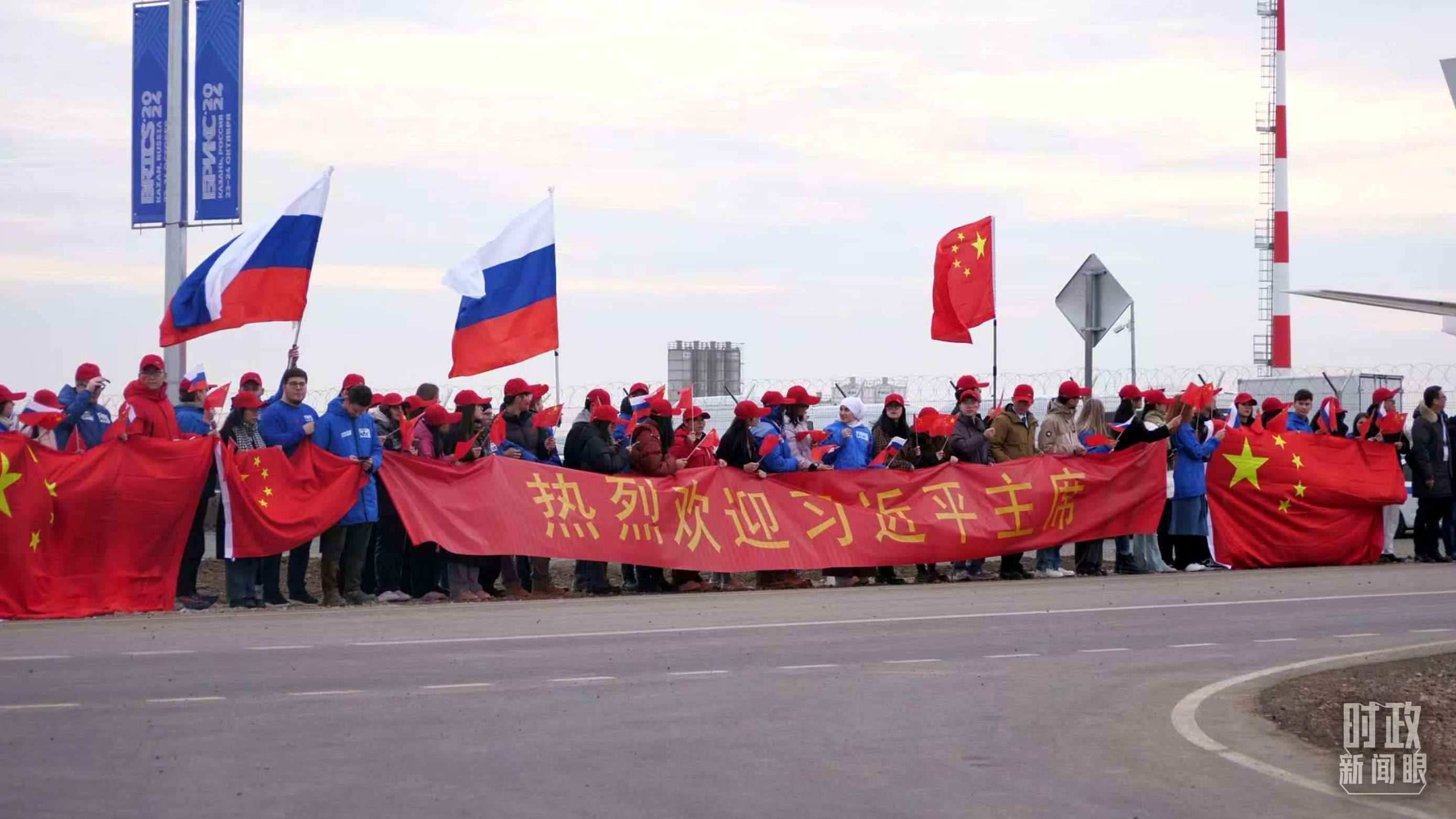 △ 俄羅斯喀山各界人士揮舞中俄兩國國旗,歡迎習主席到訪。(總臺記者蔣泓橋拍攝)