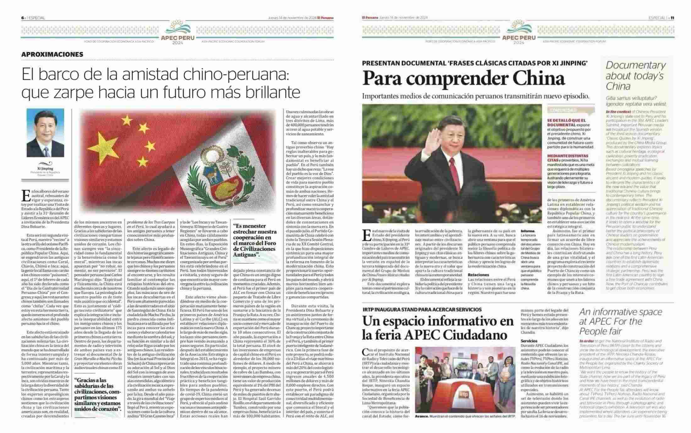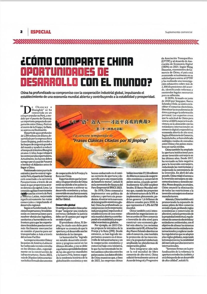 11月14日,秘魯最具影響力的官方報(bào)紙《秘魯人報(bào)》刊發(fā)節(jié)目在秘魯落播的消息。文章指出,《平“語”近人——習(xí)近平喜歡的典故》第三季展現(xiàn)了中華民族開放包容、兼收并蓄的文化胸懷,闡釋了習(xí)近平主席提出的推動(dòng)構(gòu)建人類命運(yùn)共同體的這一重大理念,是對(duì)“建設(shè)一個(gè)什么樣的世界、怎樣建設(shè)這個(gè)世界”給出的中國方案?!睹佤斎藞?bào)》特刊整版刊發(fā)《平“語”近人——習(xí)近平喜歡的典故》第三季(西班牙語版)將在秘魯主流媒體落播特稿?!睹佤斎藞?bào)》官網(wǎng)也同步刊發(fā)了節(jié)目預(yù)告消息和海報(bào)。