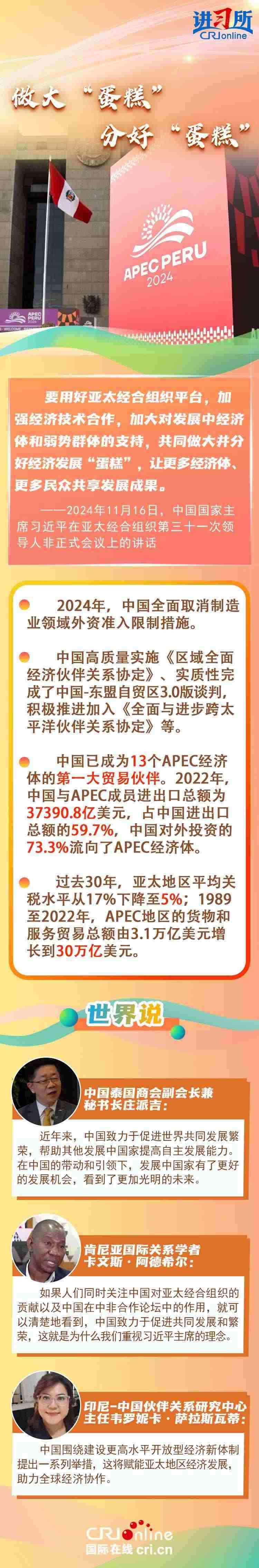 自1991年加入APEC以來,中國作為關(guān)鍵一員,持續(xù)為亞太地區(qū)成為世界經(jīng)濟(jì)的“火車頭”輸出關(guān)鍵穩(wěn)定力量,習(xí)近平主席表示,“落其實(shí)者思其樹,飲其流者懷其源”。中國的發(fā)展離不開亞太,也將進(jìn)一步造福亞太。多國人士表示,在中國的帶動和引領(lǐng)下,發(fā)展中國家有了更好的發(fā)展機(jī)會,看到了更加光明的未來。