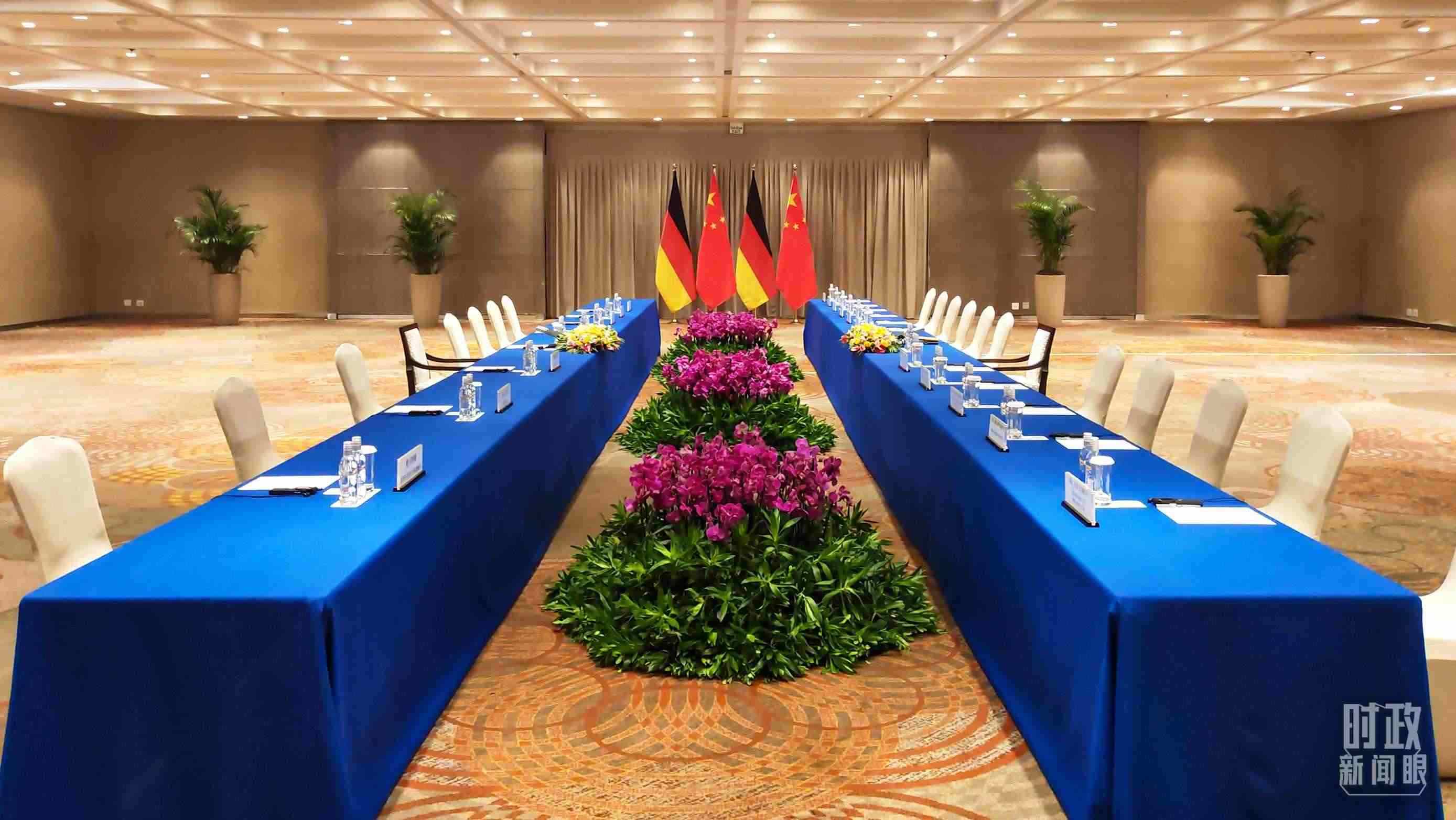 △會(huì)見(jiàn)現(xiàn)場(chǎng)的中德兩國(guó)國(guó)旗。(總臺(tái)央視記者李增仁拍攝)