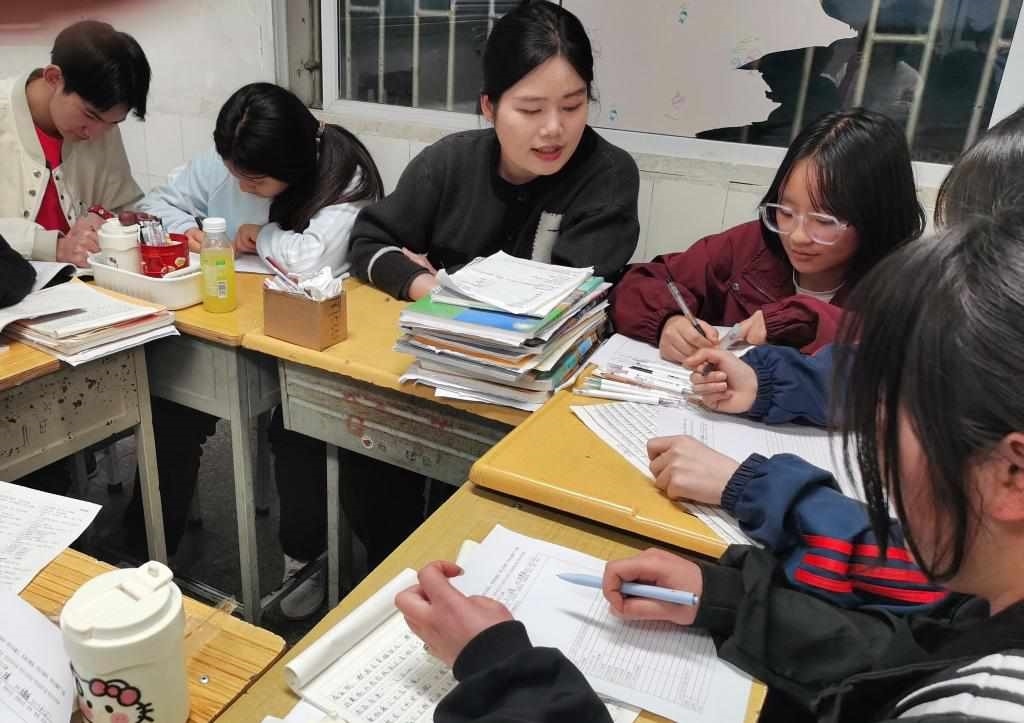 2024年4月21日,云南昭通大關(guān)一中教師劉雪瑤(左三)在輔導(dǎo)學(xué)生做作業(yè)。(李龍強 攝)