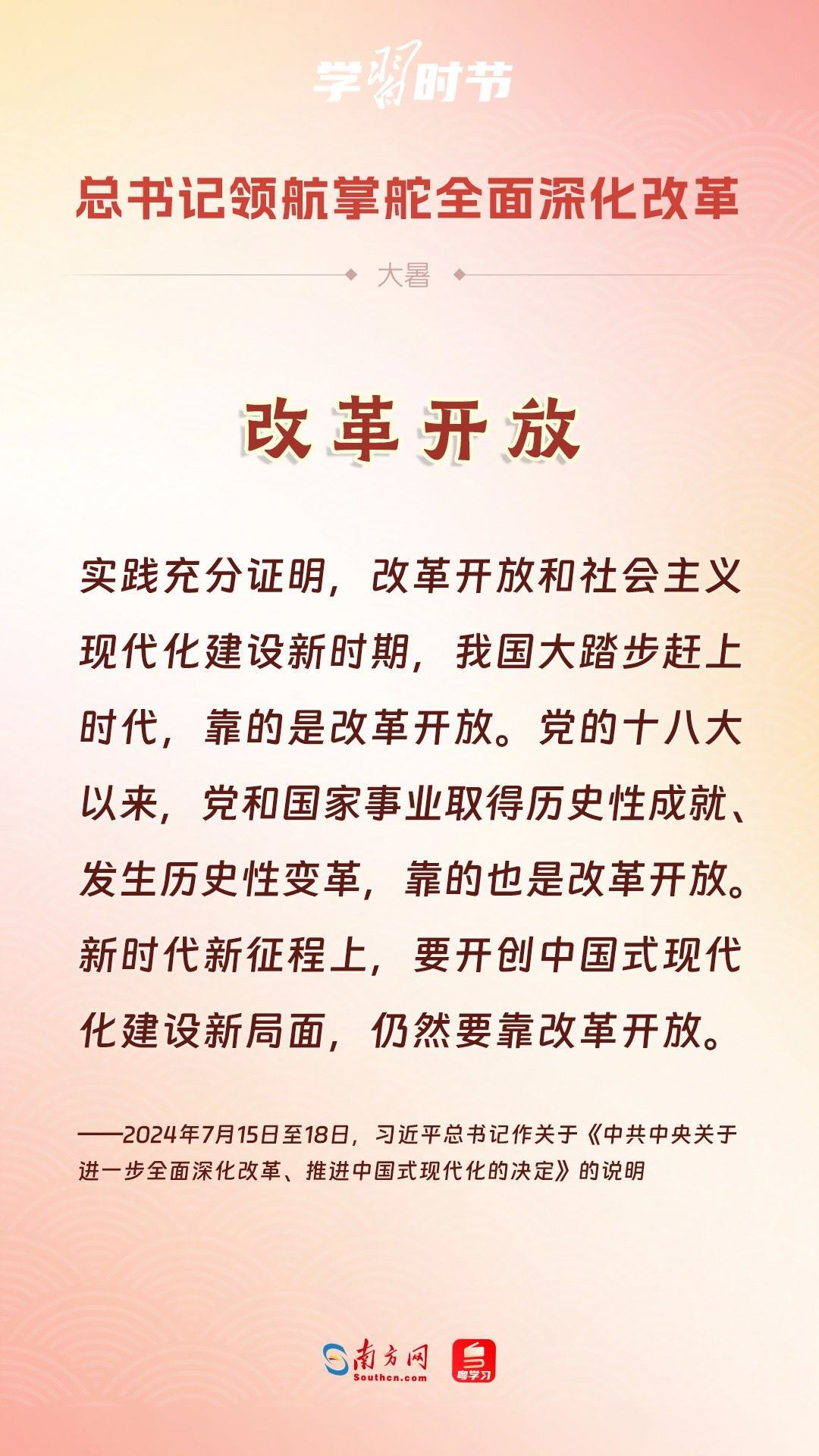 我們隆重慶祝新中國(guó)成立75周年,深情回望共和國(guó)的滄桑巨變。從五千多年中華文明的傳承中一路走來(lái),“中國(guó)”二字鐫刻在“何尊”底部,更銘刻在每個(gè)華夏兒女心中。黨的二十屆三中全會(huì)勝利召開(kāi),吹響進(jìn)一步全面深化改革的號(hào)角。我們乘著改革開(kāi)放的時(shí)代大潮闊步前行,中國(guó)式現(xiàn)代化必將在改革開(kāi)放中開(kāi)辟更加廣闊的前景。