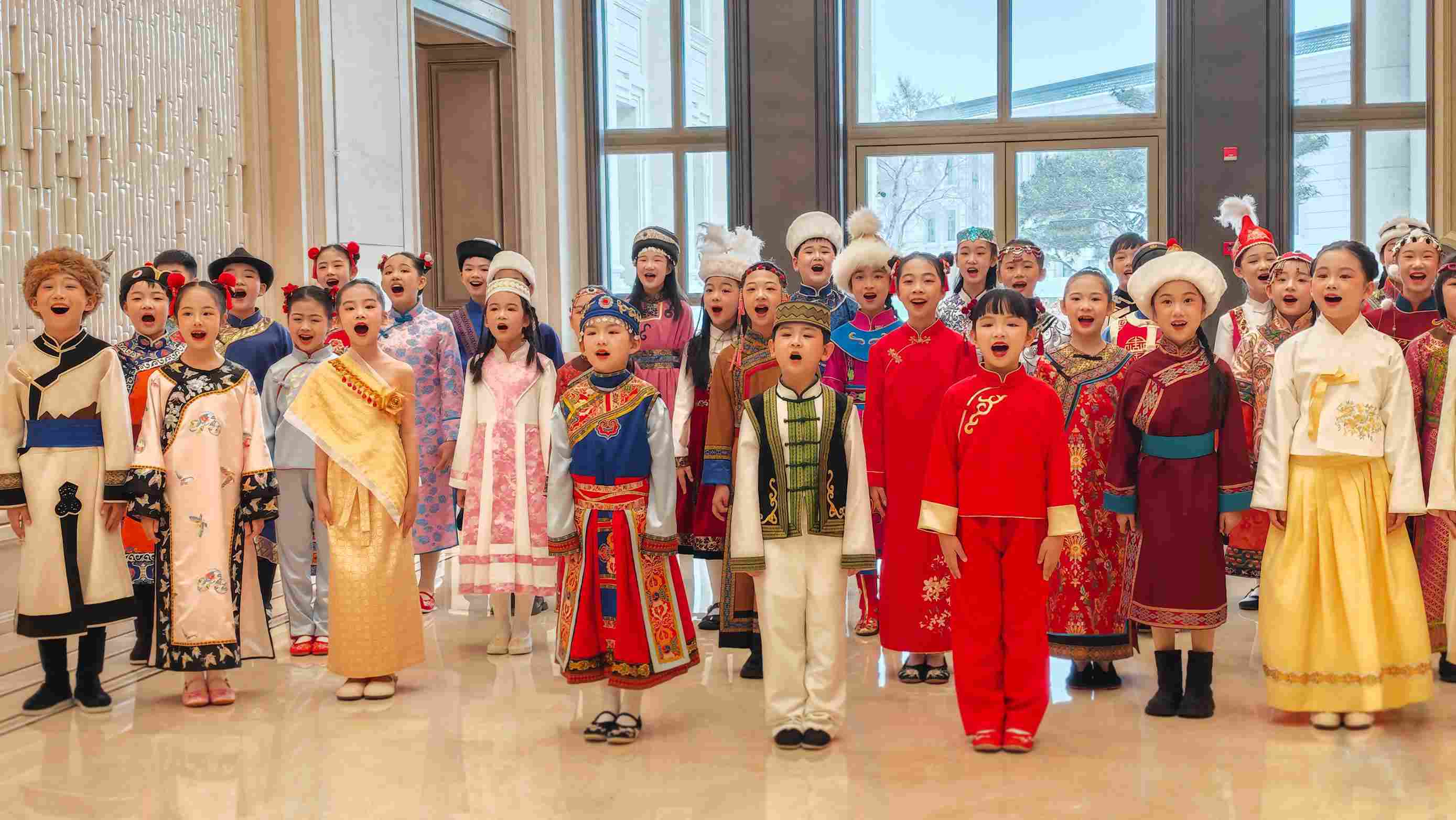 △第九屆亞冬會開幕式歡迎宴會現(xiàn)場,少年兒童表演民歌《烏蘇里船歌》。