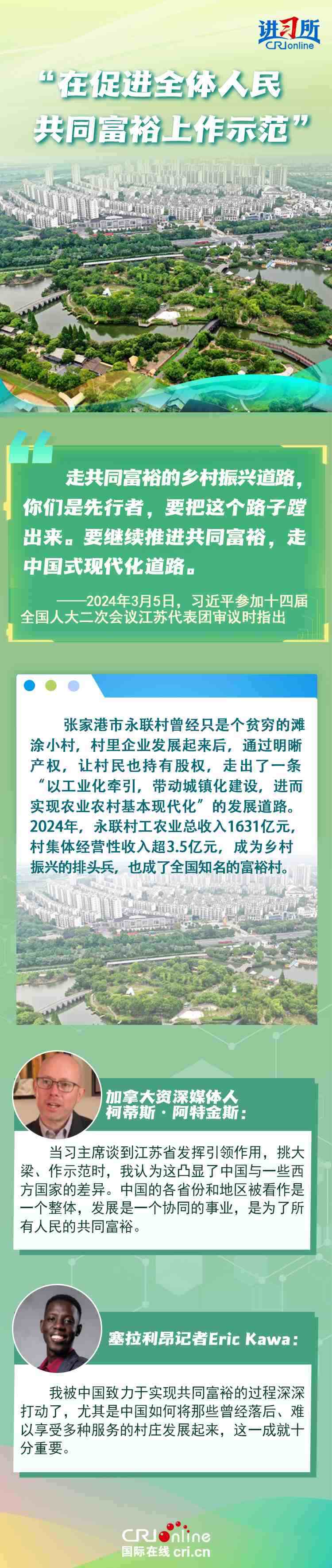 從紫金山實驗室的6G突破到蘇州工業(yè)園區(qū)的開放升級,從長三角協(xié)同創(chuàng)新到永聯(lián)村的共富實踐,江蘇在中國式現(xiàn)代化新實踐上已成為世界觀察中國高質(zhì)量發(fā)展的重要窗口。國際人士認為,中國因地制宜的創(chuàng)新發(fā)展之路有力推動了國家現(xiàn)代化進程與民生福祉提升。