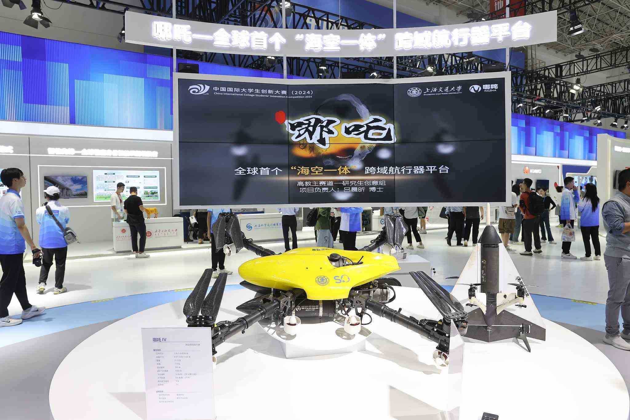 △2024年10月12日至15日,中國國際大學(xué)生創(chuàng)新大賽總決賽及同期活動(dòng)在上海舉行。來自上海交通大學(xué)的“哪吒——全球首個(gè)‘海空一體’跨域航行器平臺(tái)”項(xiàng)目奪得冠軍。
