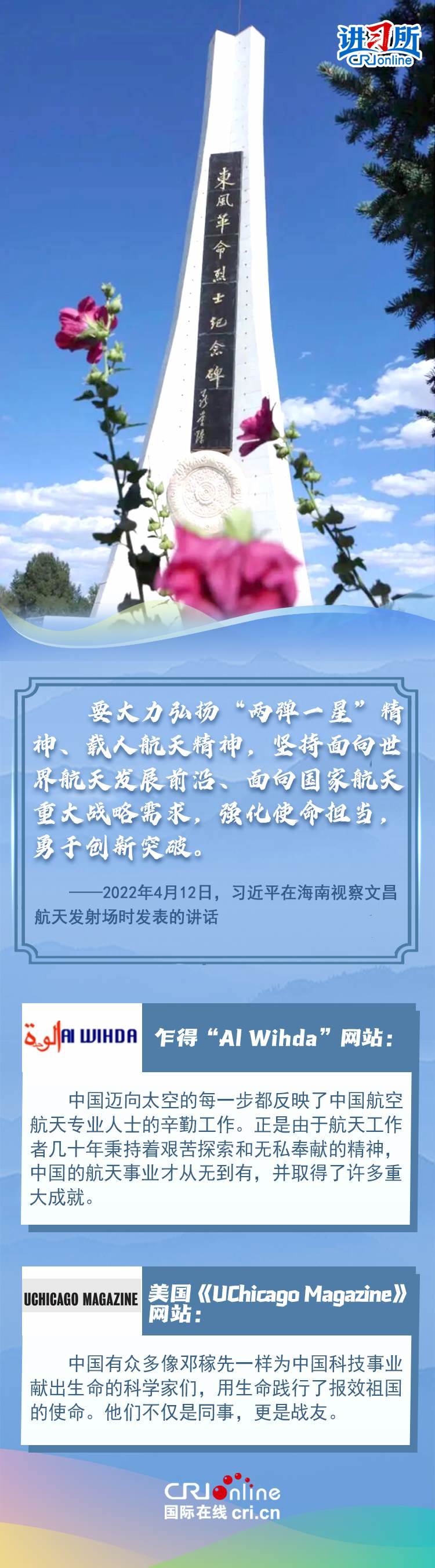 新時(shí)代以來,從設(shè)立烈士紀(jì)念日到出臺(tái)英雄烈士保護(hù)法,再到加強(qiáng)烈士紀(jì)念設(shè)施保護(hù),中國崇尚英雄、學(xué)習(xí)英雄的社會(huì)風(fēng)尚贏得國際社會(huì)贊譽(yù)。在國際人士眼中,中國多年來飛躍式的進(jìn)步和發(fā)展,離不開人們對(duì)先輩意志的繼承與實(shí)踐。