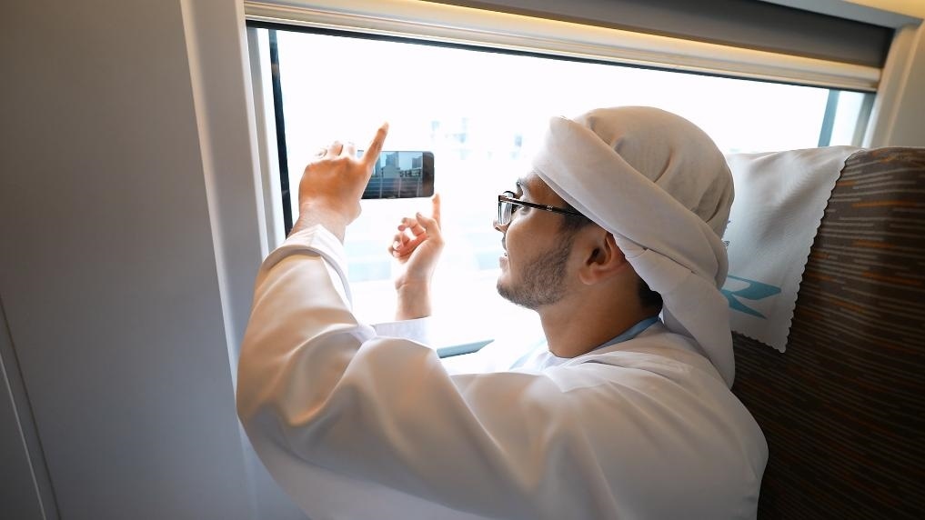 4月7日,從北京開往天津站的高鐵上,一名阿聯(lián)酋學(xué)生用手機拍攝窗外風(fēng)景。新華社記者 胡震澤 攝