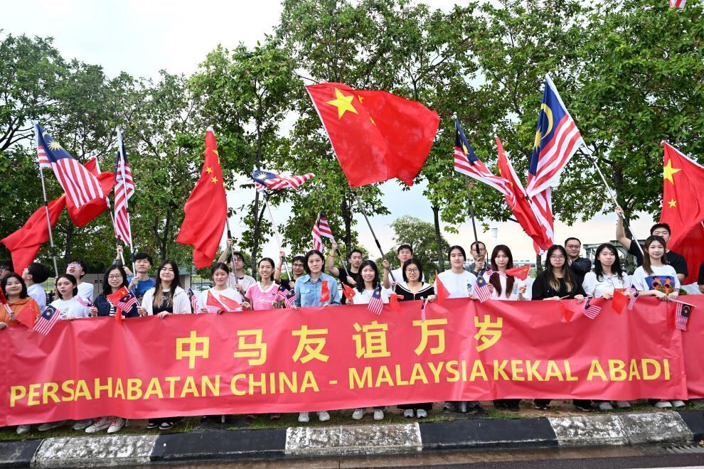 馬來(lái)西亞兒童向習(xí)近平獻(xiàn)花,馬來(lái)西亞青少年表演富有當(dāng)?shù)靥厣奈璧?,揮舞中馬兩國(guó)國(guó)旗,熱烈歡迎習(xí)近平到訪。