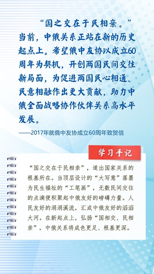 中華民族和俄羅斯民族都有悠久的歷史、古老的文明、燦爛的文化,都是偉大的民族。近年來(lái),習(xí)近平主席常常引用中國(guó)詩(shī)詞古語(yǔ)、俄羅斯諺語(yǔ)名言等,寄語(yǔ)中俄關(guān)系發(fā)展和全人類(lèi)和平與發(fā)展。這些重要論述,蘊(yùn)含對(duì)文明、歷史的深邃思考,指引著新時(shí)代的中俄關(guān)系不斷向前,為世界百年變局中的人類(lèi)文明進(jìn)步事業(yè)指明方向。