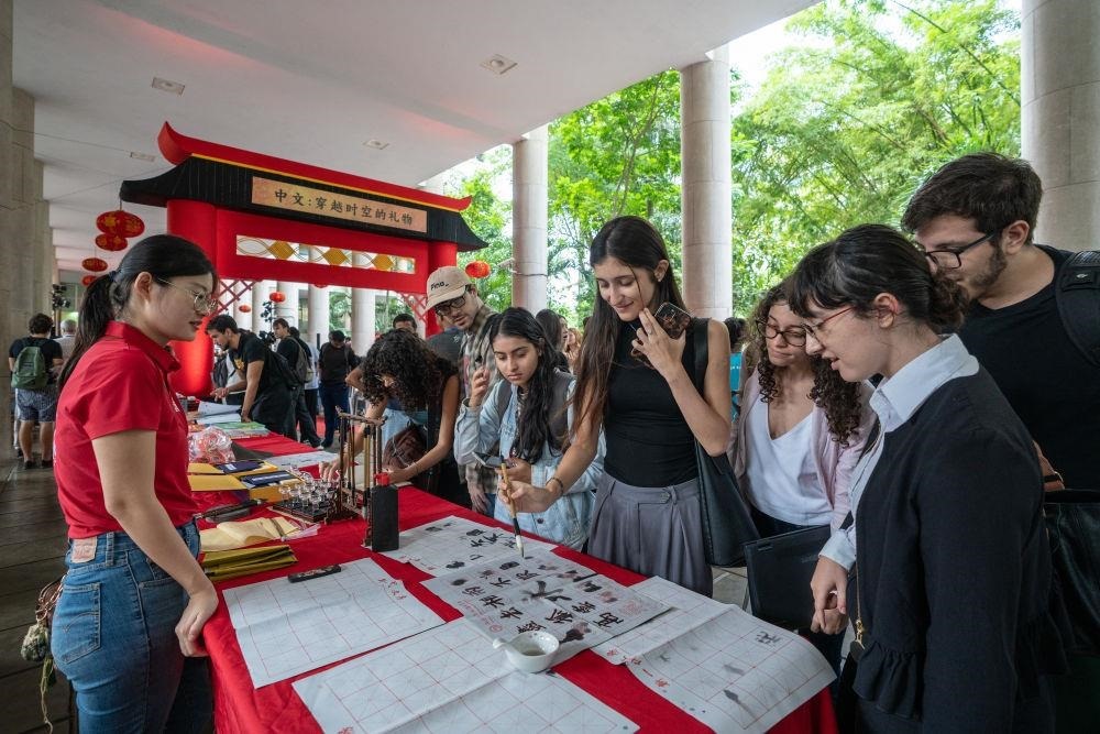 △2025年4月,在巴西里約熱內(nèi)盧天主教大學(xué)舉辦的“國際中文日”慶祝活動(dòng)上,學(xué)生們體驗(yàn)中文書法。