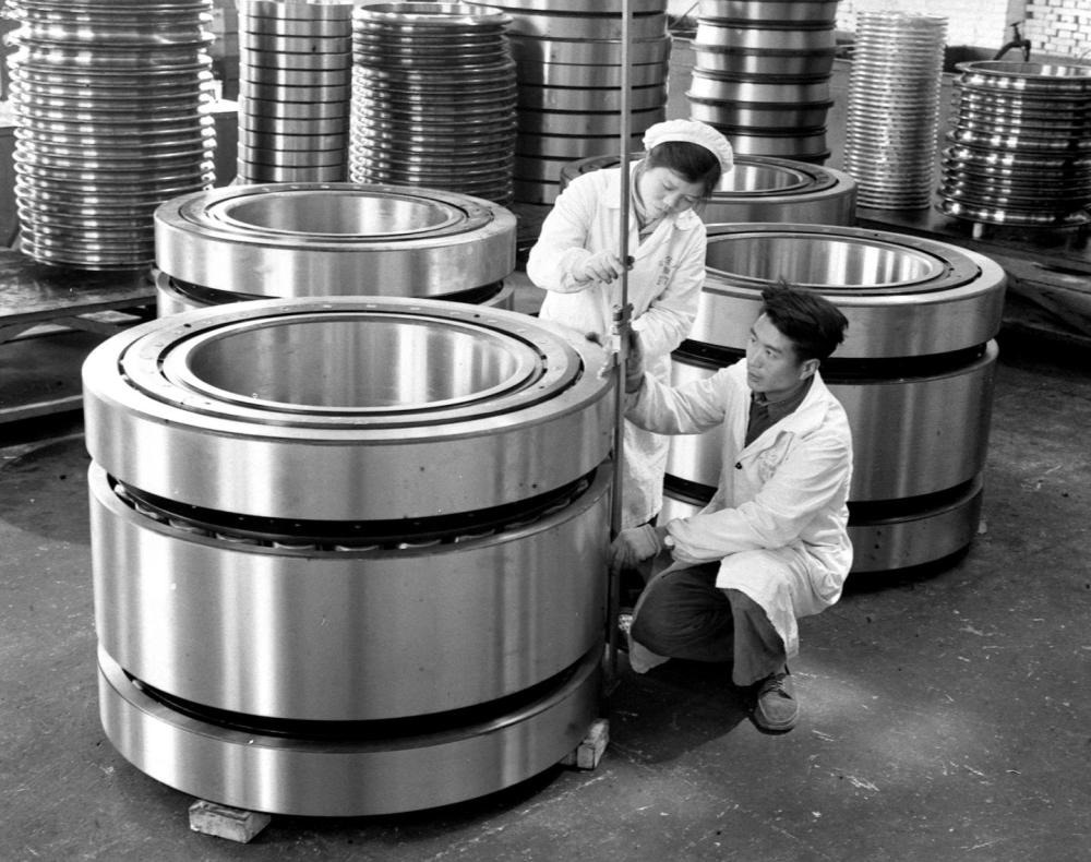 1966年,洛陽軸承廠檢驗員在細心檢查即將出廠的一批特大型軸承的質(zhì)量。