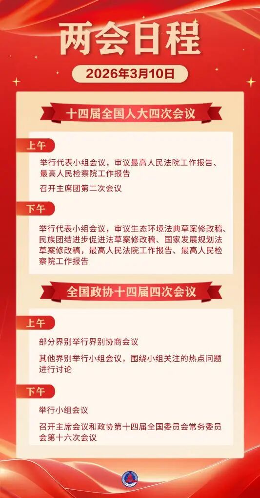 兩會日程預(yù)告丨3月10日:人代會審議“兩高”工作報告等 政協(xié)舉行界別協(xié)商會議和小組會議