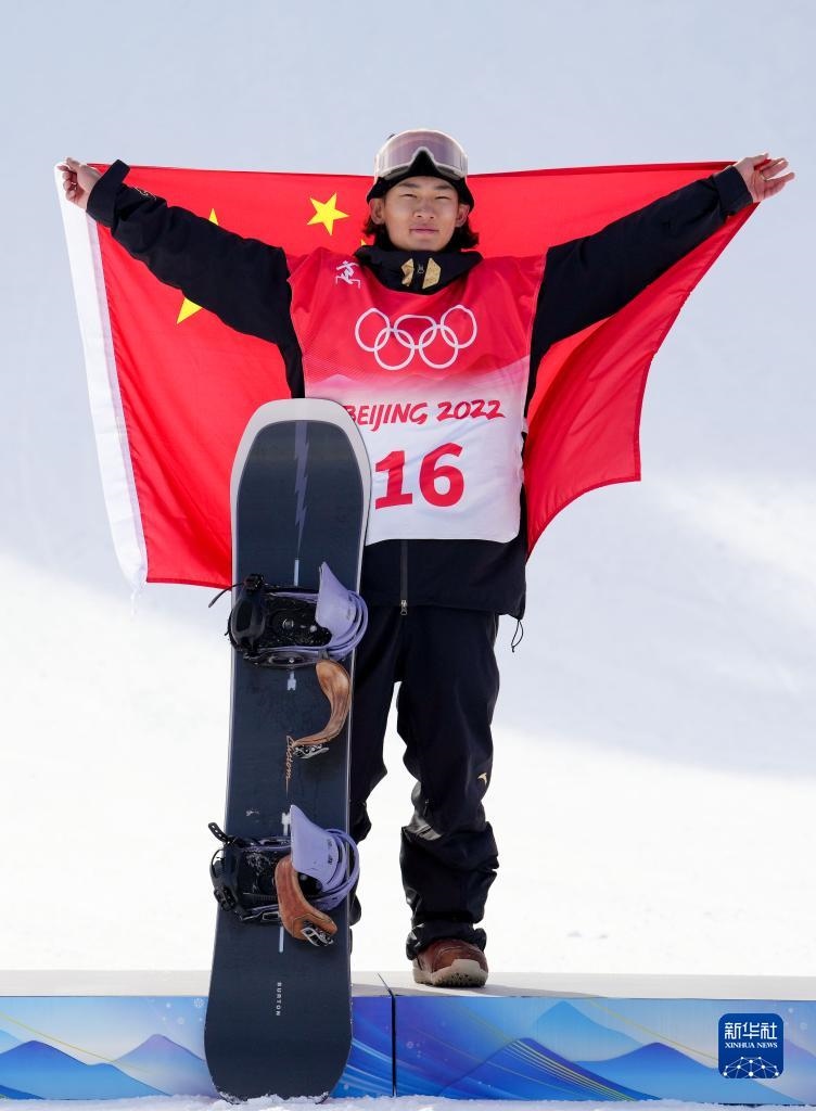 2月7日,中國選手蘇翊鳴在比賽后慶祝。