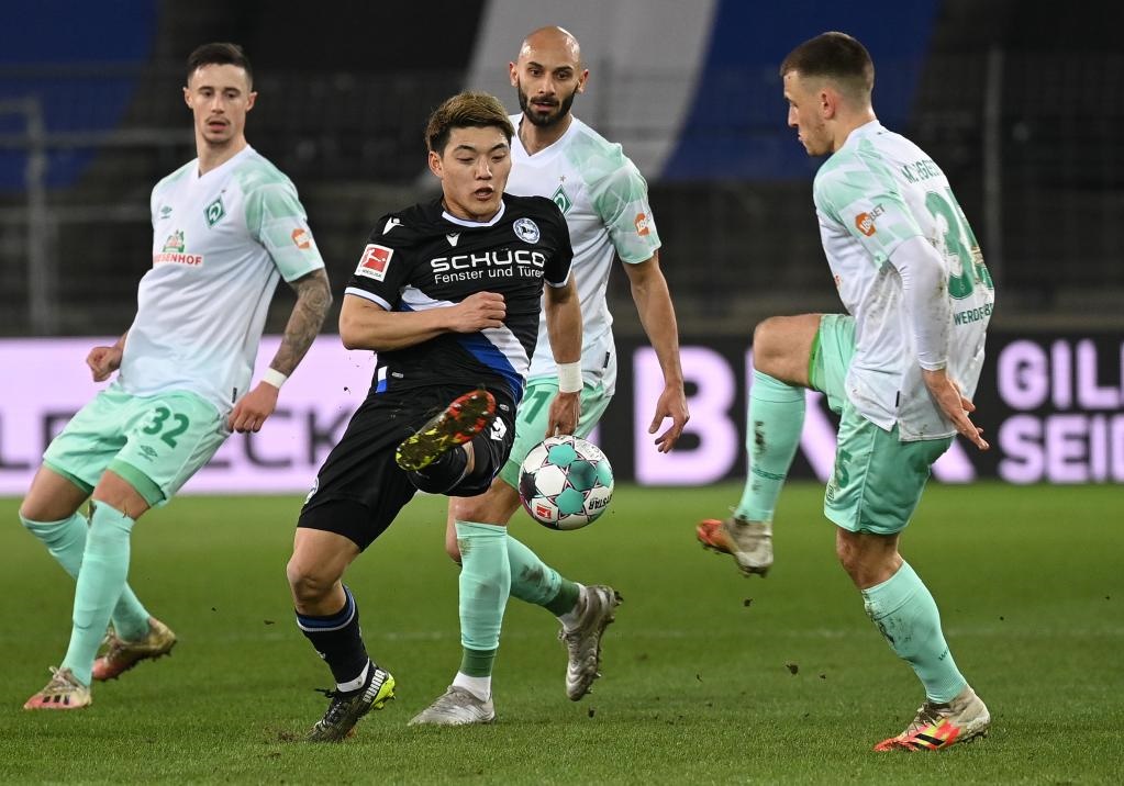 2021年3月10日,當(dāng)時(shí)效力于比勒菲爾德隊(duì)的日本球員堂安律(前左)在德甲比賽中帶球突破。他現(xiàn)在效力于德甲弗賴堡俱樂(lè)部。新華社發(fā)(烏爾里?!ず蚣{格爾 攝)