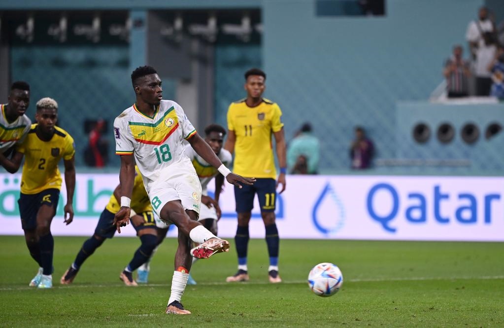 11月29日,塞內(nèi)加爾隊(duì)球員伊斯梅拉·薩爾(前)在比賽中主罰點(diǎn)球破門。新華社記者 陳誠 攝