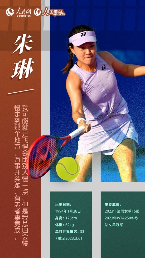 今年年初,29歲的朱琳給自己定了新賽季兩個目標(biāo):拿一個WTA巡回賽單打冠軍、世界排名進入前50位。朱琳在澳網(wǎng)接連戰(zhàn)勝多位好手,首次闖進大滿貫女單16強。2月5日,在WTA華欣站女單決賽中,朱琳戰(zhàn)勝烏克蘭選手特蘇倫科,獲得職業(yè)生涯首個WTA女單冠軍,同時世界排名上升至41位,創(chuàng)造個人最佳成績。僅用了一個月,她就實現(xiàn)了年初制定的目標(biāo)。上周,朱琳打進WTA250蒙特雷站4強,將排名提升至第33位,再創(chuàng)個人新高。相信在未來的賽場上,“大器晚成”的朱琳還將創(chuàng)造更多的驚喜。