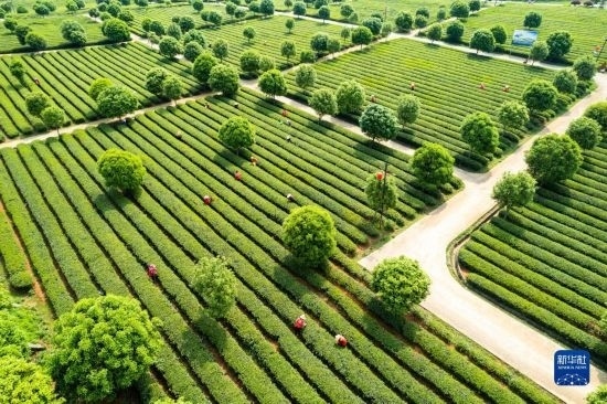 4月11日,在長沙望城烏山貢茶基地,茶農(nóng)在采摘春茶(無人機照片)。