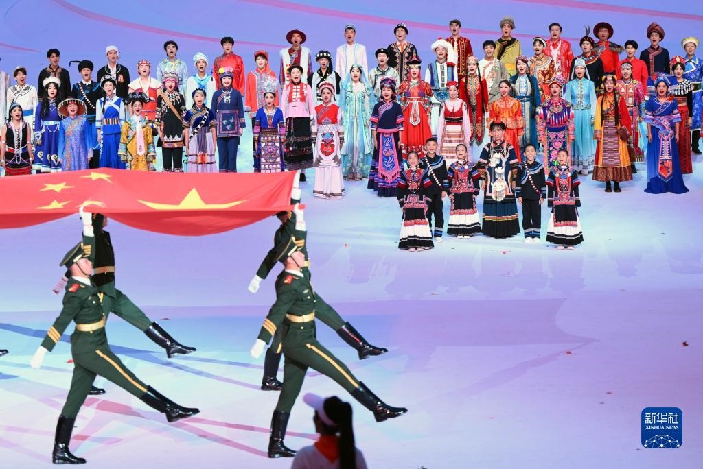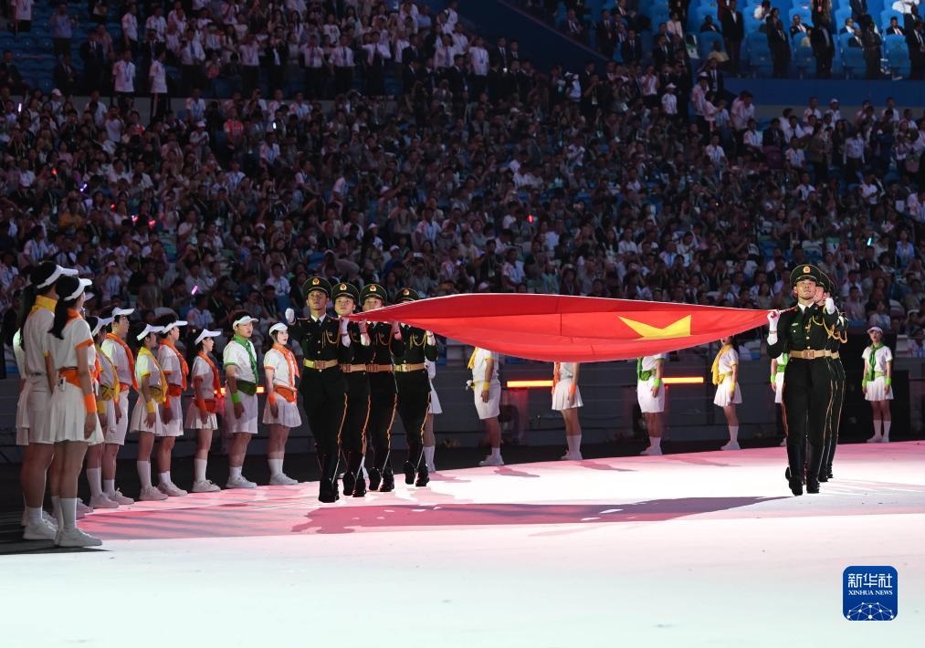 這是7月28日拍攝的開(kāi)幕式上的升旗儀式。