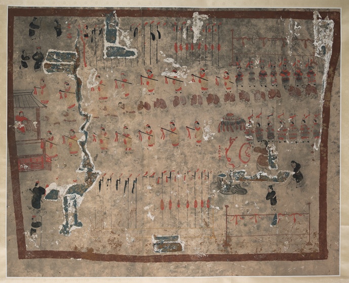 再繞回前室中層,橫跨東北西3面墓壁即是《護(hù)烏桓校尉出行圖》。墓主人所乘軺車,駕3匹黑馬,榜題“使持節(jié)護(hù)烏桓校尉”等字,主車前后有鼓車、斧車,層層環(huán)護(hù)眾多武官、兵丁,隨從有“別駕從事”“功曹從事”“校尉行部”等下屬官職,連車列騎,旗旌飄揚(yáng),場(chǎng)面極為壯觀。中室東壁下半部描繪的是《寧城圖》與《護(hù)烏桓校尉幕府圖》?!秾幊菆D》畫有城垣、城門、衙署等內(nèi)容,其中寧城南門外武士持戟列隊(duì)、身著胡服的少數(shù)民族人物徐徐入內(nèi)的場(chǎng)景最為突出。占據(jù)主畫面的是《護(hù)烏桓校尉幕府圖》,由于任護(hù)烏桓校尉官職是墓主人一生中最值得炫耀的經(jīng)歷,所以,此圖描繪得最為詳細(xì)夸張,是整個(gè)壁畫中的核心部分。整個(gè)幕府分為堂院、營(yíng)舍和庖舍3個(gè)部分,堂屋為高大的廡殿式房屋,墓主人端坐堂上,堂下藝人在表演樂(lè)舞雜耍,少數(shù)民族人物伏拜覲見(jiàn),周圍環(huán)立官吏武士,場(chǎng)面喧囂隆重。營(yíng)舍位于幕府后院,是幕府中管理軍務(wù)的機(jī)構(gòu)所在,庖舍位于幕府的西南角,掌管幕府廚飲之事。