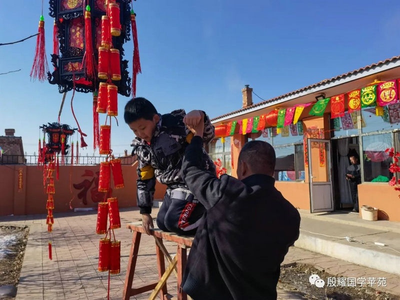 父親讓曈曈接地氣的愿望實現(xiàn)了,長得越來越壯實的曈曈真是打心眼喜歡上了農(nóng)村,喜歡看叔叔大爺們是如何勞動的。春天澆地的時候,他跟上我的發(fā)小利利到地里去,手里拿上一張鐵鍬學(xué)著去攏堰堤;秋收的時候他爬上了丁補元駕駛的收割機,感受農(nóng)民們收割玉米的喜悅;接羔的時候,他又鉆進利軍家的羊群里,抱著出生沒有幾天的小羊羔,給小羊羔喂牛奶……春節(jié)前的一兩天是他最忙的時候:一會跟上大爹貼春聯(lián),一會跟上茹義大爺掛紅燈,忙得不亦樂乎。前一段時間回村里他又要跟上利軍大爺出村放羊去,又要跟上茹義大爺去種玉米,在城里他是見識不到這些的。