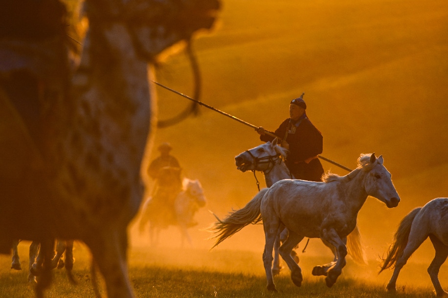 2022年5月17日,牧民在內蒙古錫林郭勒盟西烏珠穆沁旗的草原上套馬。