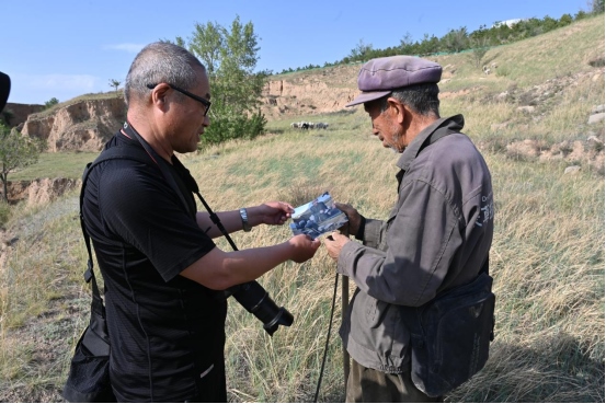 鏡頭見證滄桑,筆尖記錄百姓。這些年,只要疫情緩解,長城人沒有停下腳步,而是一次又一次去看長城、看邊堡、看邊墻下的鄉(xiāng)親們。車靜靜地行駛在空曠、蒼涼的長城腳下,76歲的牧羊人呂三良正在長城邊牧羊。2022年5月24日,呼和浩特市長城科普學(xué)會會員追隨牧羊人的腳步,把照片送到呂三良手中,看著老人端詳著照片里的自己,會員們特別滿足。這,難道就不是一個攝影人的長城情懷、百姓情懷嗎?(郭雁平 高曉梅)