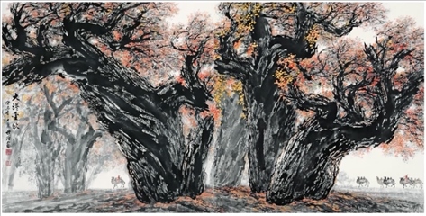 梁先生曾旅居西藏四個(gè)月,不僅為人民大會堂西藏廳創(chuàng)作了巨幅國畫《雪山雄鷹》,同時(shí)收獲了數(shù)百張速寫和寫生稿。他還四上黃山,兩次到三峽。2000年,70多歲的梁世雄又深入新疆無人區(qū)胡楊林中進(jìn)行素材收集。此后,大漠胡楊成了梁世雄作品新的視覺符號。