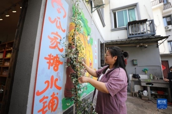5月23日,在浙江省義烏市李祖村,“南瓜家糖水鋪”的主理人封玲在整理庭院內(nèi)的植物。