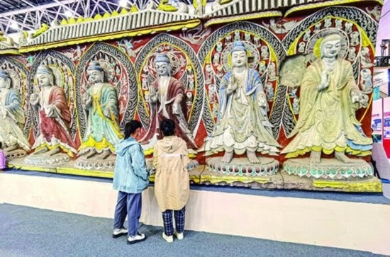 2023年10月19日,游客欣賞3D打印的云岡造像。新華每日電訊記者王學(xué)濤攝