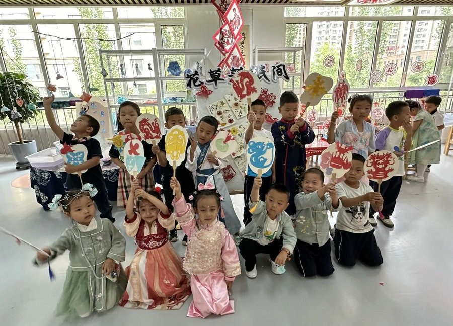 在剪紙區(qū),中大班的小朋友剪出了一張張漂亮的剪紙,把它們貼在了古色古香的扇子上,制作出了消暑清涼的扇子。