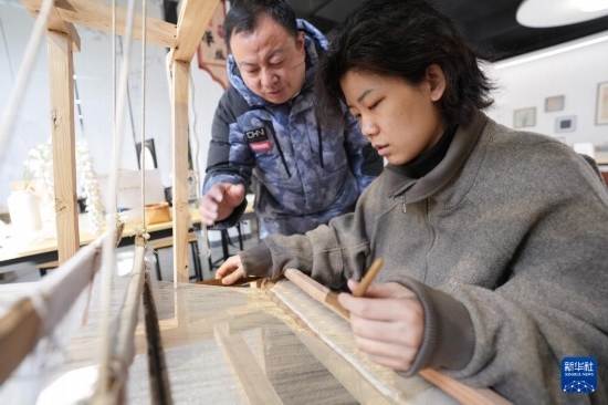 2月19日,柯翔祥(左)在德清莫干山鎮(zhèn)由蠶種場改造的絲綢技藝展示館給從西安前來研學的大學生介紹緙絲技術(shù)。