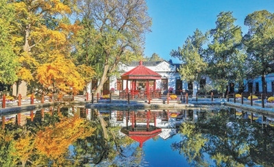 北京香山雙清別墅六角紅亭周邊景色。