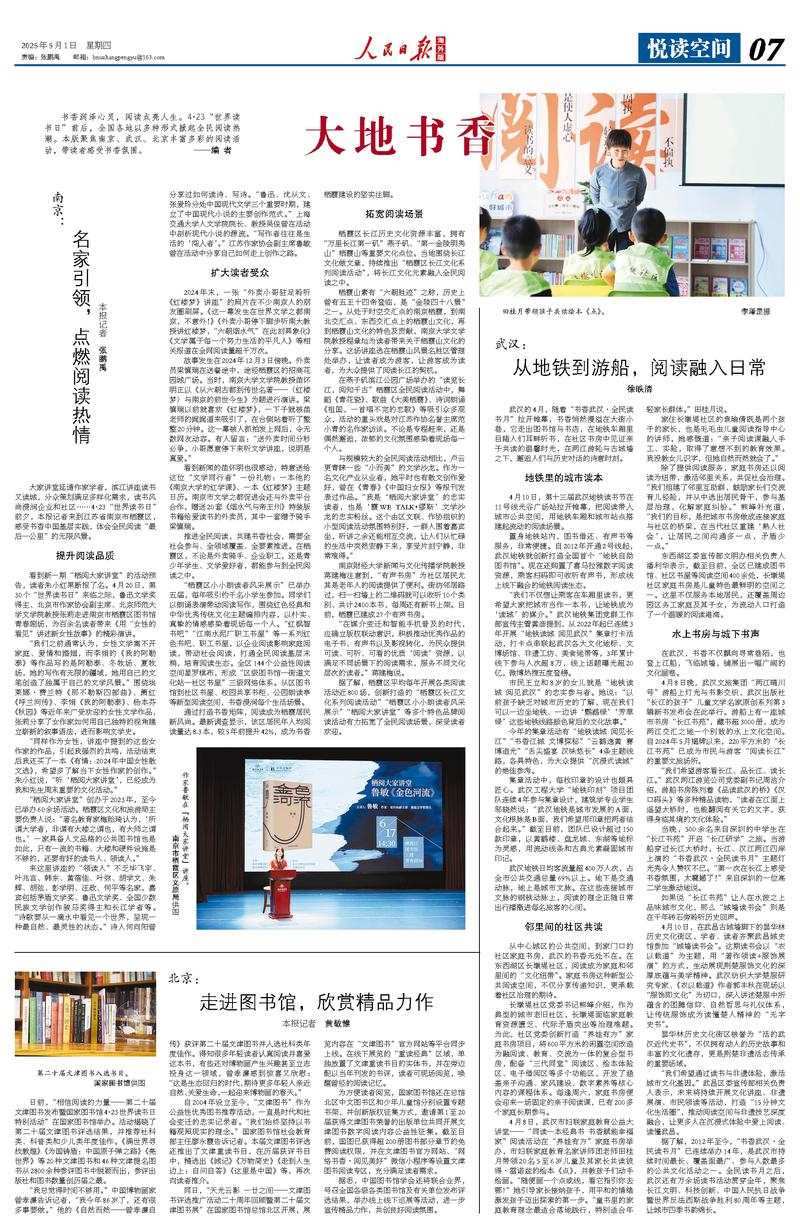書(shū)香潤(rùn)澤心靈,閱讀點(diǎn)亮人生。4·23“世界讀書(shū)日”前后,全國(guó)各地以多種形式掀起全民閱讀熱潮。本版聚焦南京、武漢、北京豐富多彩的閱讀活動(dòng),帶讀者感受書(shū)香氛圍。