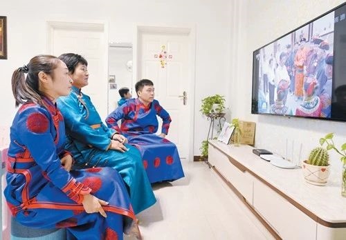 市民月金星一家身著民族服裝觀看新聞聯(lián)播。
