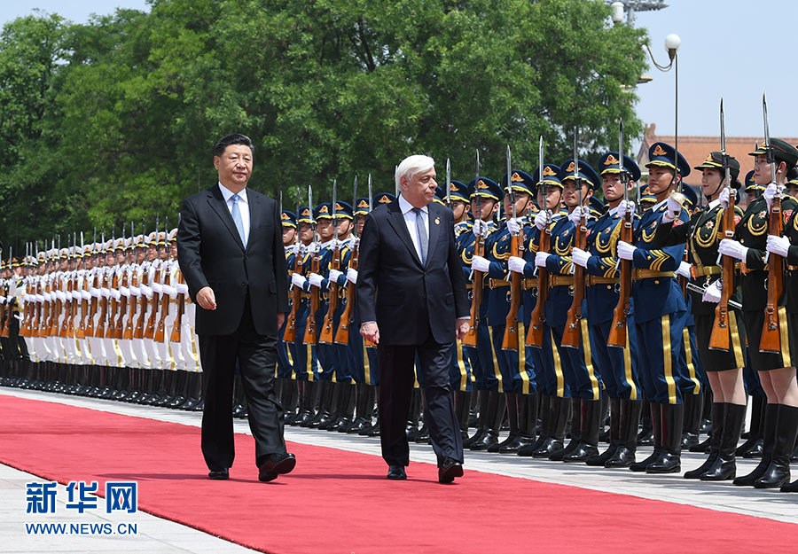 5月14日,國家主席習近平在北京人民大會堂同希臘總統(tǒng)帕夫洛普洛斯舉行會談。這是會談前,習近平在人民大會堂東門外廣場為帕夫洛普洛斯舉行歡迎儀式。 新華社記者 張領(lǐng) 攝