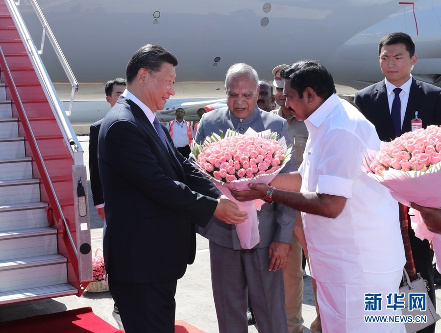 10月11日,國(guó)家主席習(xí)近平乘專機(jī)抵達(dá)金奈,應(yīng)印度共和國(guó)總理莫迪邀請(qǐng),出席中印領(lǐng)導(dǎo)人第二次非正式會(huì)晤。印度泰米爾納德邦邦長(zhǎng)普羅希特、首席部長(zhǎng)帕拉尼斯瓦米等在舷梯旁迎接,向習(xí)近平敬獻(xiàn)鮮花。