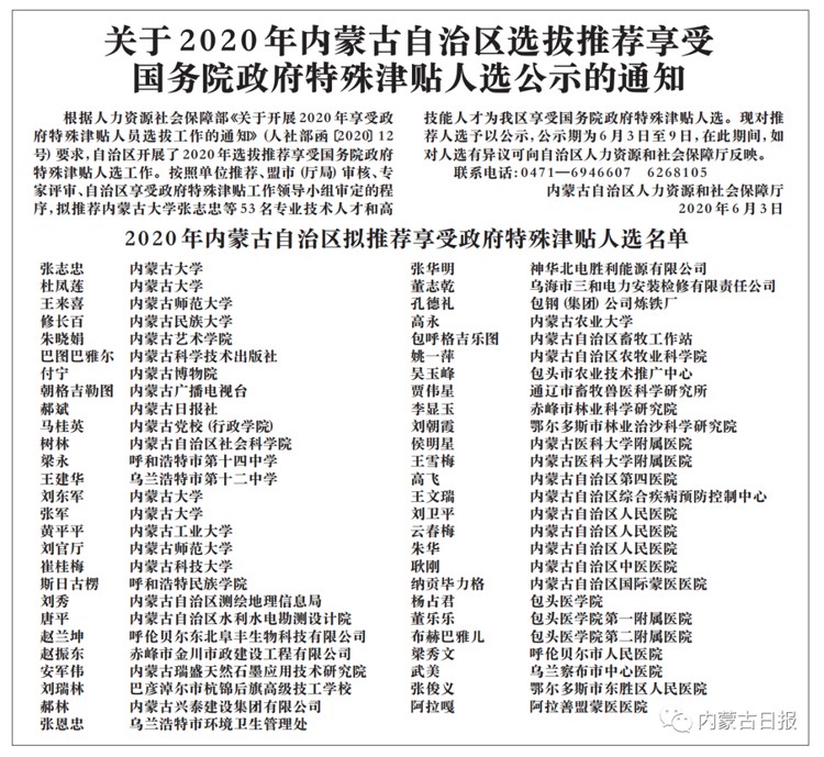 根據(jù)人力資源社會保障部《關(guān)于開展2020年享受政府特殊津貼人員選拔工作的通知》(人社部函〔2020〕12號)要求,自治區(qū)開展了2020年選拔推薦享受國務(wù)院政府特殊津貼人選工作。按照單位推薦、盟市(廳局)審核、專家評審、自治區(qū)享受政府特殊津貼工作領(lǐng)導(dǎo)小組審定的程序,擬推薦內(nèi)蒙古大學(xué)張志忠等53名專業(yè)技術(shù)人才和高技能人才為我區(qū)享受國務(wù)院政府特殊津貼人選?,F(xiàn)對推薦人選予以公示,公示期為6月3日至9日,在此期間,如對人選有異議可向自治區(qū)人力資源和社會保障廳反映。
