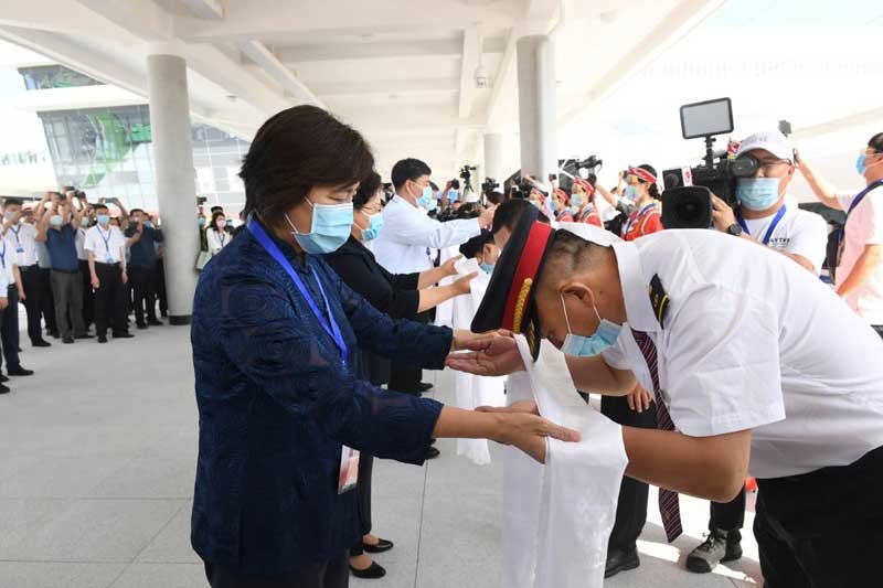 自治區(qū)黨委副書記、自治區(qū)主席布小林宣布赤喀高鐵正式開(kāi)通運(yùn)營(yíng),并與自治區(qū)副主席艾麗華、自治區(qū)政府秘書長(zhǎng)包振玉以及中國(guó)鐵路沈陽(yáng)局集團(tuán)有限公司、蒙遼鐵路客運(yùn)專線有限責(zé)任公司、赤峰市委負(fù)責(zé)同志一起為列車組人員敬獻(xiàn)哈達(dá)。
