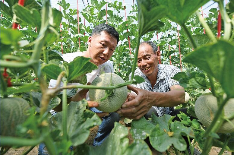 2020年7月,呼和浩特市賽罕區(qū)黃合少鎮(zhèn)賽音不浪村建立網(wǎng)紋瓜種植基地,科技特 派員 李國 慶(左)向種植戶提供技術(shù)、種子,采取訂單銷售,帶領(lǐng)村民致富。