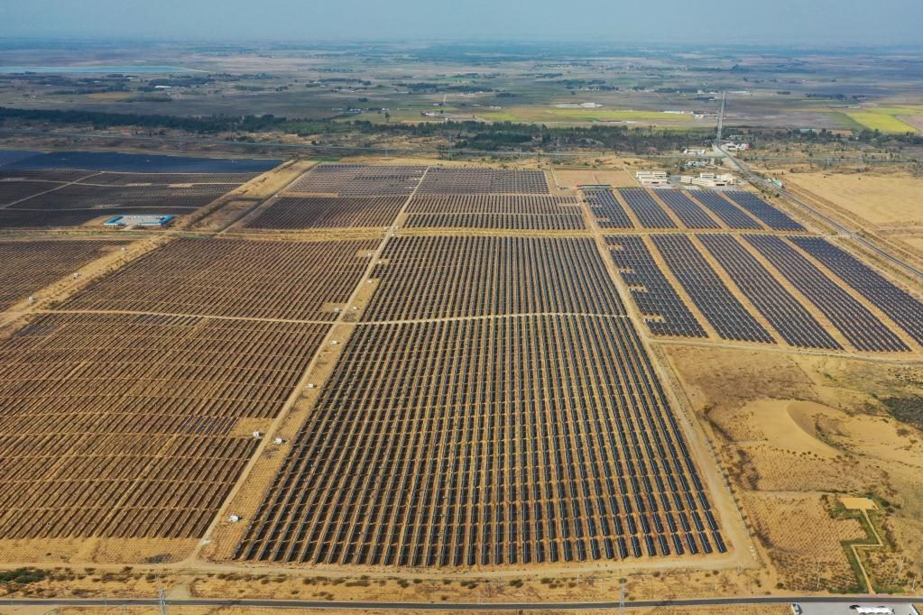 達(dá)拉特旗光伏發(fā)電應(yīng)用領(lǐng)跑基地(無(wú)人機(jī)照片)。新華社記者 李志鵬攝