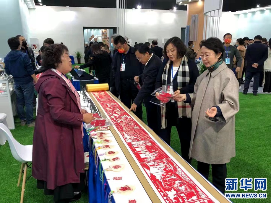 參會(huì)嘉賓在傳統(tǒng)手工藝品、文創(chuàng)產(chǎn)品展覽展示區(qū)參觀。新華網(wǎng) 李國棟 攝
