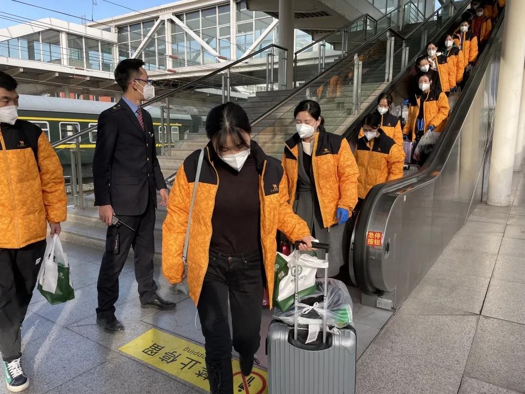 15時(shí),車站工作人員引導(dǎo)醫(yī)務(wù)人員快速通過(guò)專用通道,開(kāi)始登車。