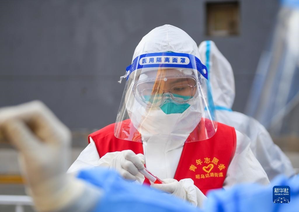 連日來(lái),在呼和浩特市的戰(zhàn)“疫”路上,志愿者沖鋒在前。他們協(xié)助開(kāi)展核酸檢測(cè)、社區(qū)管控等工作,為筑牢防疫安全屏障貢獻(xiàn)自己的力量。(新華社記者 彭源攝)