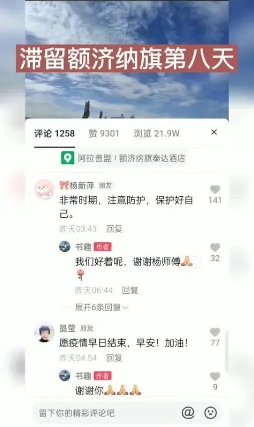 視頻發(fā)出數(shù)小時就吸引了上萬的瀏覽量。視頻發(fā)布者王女士在視頻中呈現(xiàn)一家人滯留額濟(jì)納旗現(xiàn)況的同時,也給和她同樣滯留額濟(jì)納旗的近萬名游客鼓勁:“如果你此時正在阿拉善,愿你如胡楊般堅強(qiáng),積極應(yīng)對疫情。”