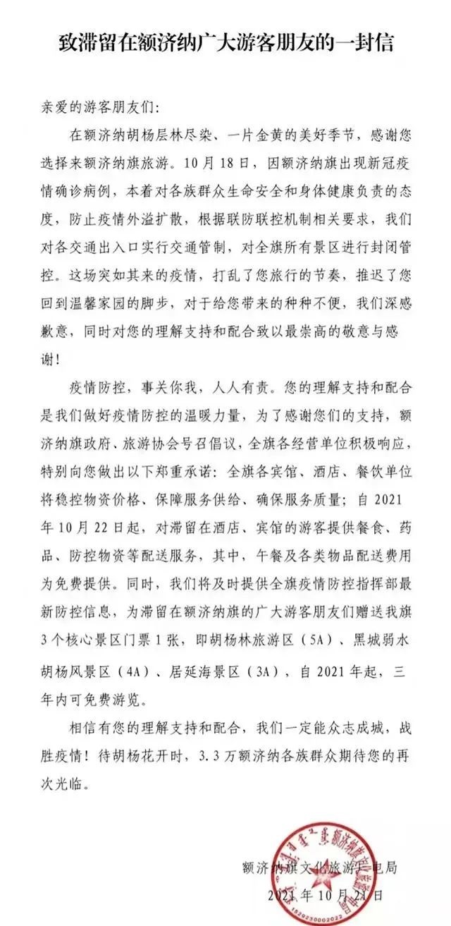 這封公開信中寫道,自10月22日起,對滯留在酒店、賓館的游客提供餐食、藥品、防控物資等配送服務(wù),其中,午餐及各類物品配送費(fèi)用為免費(fèi)提供;為滯留游客贈送胡楊林旅游區(qū)(5A)、黑城弱水胡楊風(fēng)景區(qū)(4A)、居延海景區(qū)(3A)3個核心景區(qū)門票1張,自2021年起,三年內(nèi)可免費(fèi)游覽。