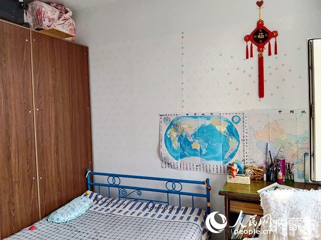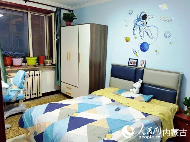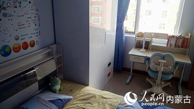 在對原有住房進行規(guī)劃、設(shè)計后,施工隊開始裝修,并配備必要的家具、臥具和學習生活用品。歷時半個多月,一間以藍色為主色調(diào)的小屋建成了。現(xiàn)在,屬于浩博的那一半臥室,泛黃的臥室墻壁被粉刷成淡藍色,換了新的小床和衣柜,新添置的書桌上擺滿了課外書,看起來整潔又溫馨。