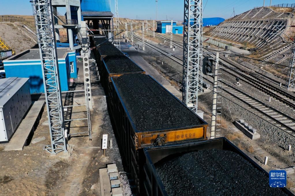 這是11月23日在位于鄂爾多斯市的淮河能源西部煤電集團(tuán)色連二礦罕臺川集裝站拍攝的正在裝煤的列車(無人機(jī)照片)。新華社記者李志鵬攝