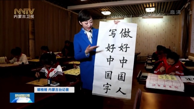 娜格婭 內(nèi)蒙古臺記者:做好中國人,寫好中國字,你能想到我手中的這些字,是一個(gè)四年級小朋友寫的嗎?我現(xiàn)在是在呼和浩特鋼鐵路第二小學(xué)的興趣課上,學(xué)生們正在學(xué)習(xí)寫毛筆字,一筆一劃傳承書法文化,一撇一捺書寫著愛國情懷。像這樣的興趣課每周有一次。